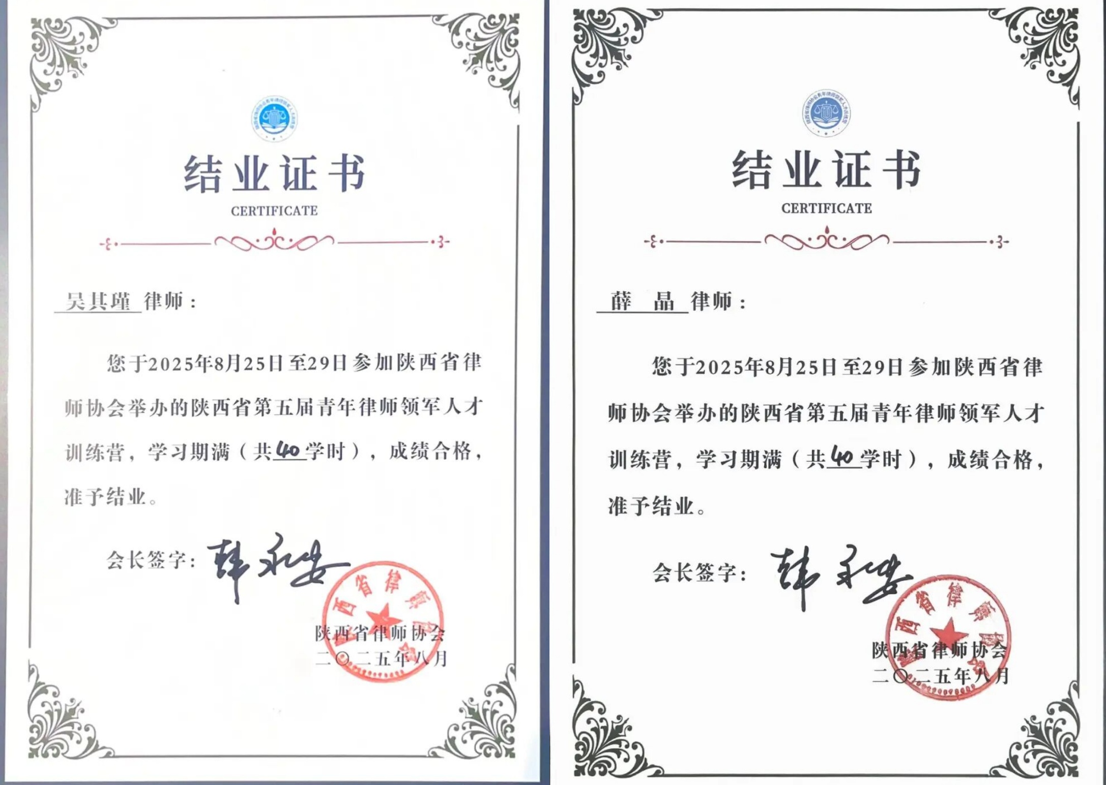 2025年8月29日,由陕西省律师协会主办的第五届青年律师领军人才训练营圆满结业。来自陕西全省及山西、内蒙古、甘肃、青海、宁夏、新疆、重庆、四川、河南、新疆生产建设兵团等地的129名优秀青年律师参训。富能青年律师吴其瑾、薛晶(神木分所)参加本次训练营并顺利结业。