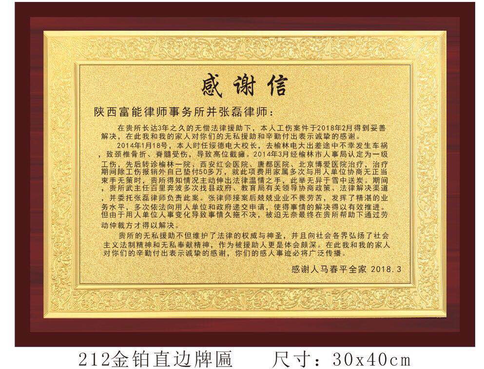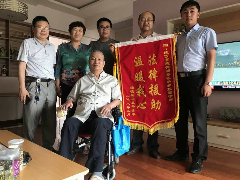 曾任绥德电大校长的马春平老师2014年初因公肇事致高位截瘫,当时家人承受着精神与经济的双重压力,特别是护理费、一次性用品、外购药品长期得不到所在单位支付。武广韬主任及时伸出法律援助之手,与张磊律师为其进行了长达三年多的服务。期间,他们奔波在绥德榆林两地,交涉于行政、仲裁机构,不厌其烦的电话咨询、文书起草,费用分文未收。辛勤的服务,促成马春平老师除能按月享受工伤待遇外,护理费、一次性用品、外购药品等垫付费用通过仲裁也得到赔偿解决。法律援助支撑了他的治疗,促进了其安心康复。赔偿结案后马春平家属向我所发来热情洋溢的《感谢信》,表达了真挚的感激之情。武广韬主任一直挂念着马春平的康复状况,这次看到他身体状况越来越好,可以抬起左手时,甚感欣慰。他表示我所始终注重广大律师的社会责任培养,会对更多的弱势群体进行法律援助。马春平家人将一面“法律援助 温暖我心”的锦旗赠送我所,再次表达对周到法律服务的感激之情。