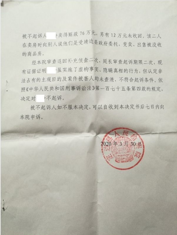 该案中犯罪嫌疑人任某是系房地产开发项目的共有人,经公司授权全权处理公司的一切事宜。该项目完工后部分房屋因违规超建被靖边县住房和城乡建设局予以没收处罚。靖边县公安机关侦查后认为任某在明知该行政处罚决定的情况下出卖数套房屋的行为涉嫌合同诈骗罪,并移交靖边县检察院检察院审查起诉。徐良河律师团队在接受任某家属委托后,经过多次与任某会见,并认真研究了全部案卷材料,全面了解案件情况后,撰写了多份辩护意见。认为构成合同诈骗罪的主观要件是直接故意且具有非法占有他人财物的目的,本案中任某没有合同诈骗非法占有的主观故意。其一任某某系涉案房地产开发项目的共有人,公司也授权其处理一切相关事宜,有权利也有资格销售公司开发的房屋;其二任某给本案所谓的“被害人”出售的是属于公司的房屋,而不是政府的房屋;其三任某销售部分决定没收的房屋时,并不知道靖边县住房和城乡建设局作出的《行政处罚决定书》;其四依照法律规定,县住房和城乡建设局作出的靖《行政处罚决定书》的是否发生法律效力值得商榷,且没收对象不明,无法履行;其五行政处罚决定书何时发生法律效力不明确,在生效前出卖被政府决定没收的房屋的行为,明显不构成合同诈骗;其六任某销售已经决定没收的房屋,其性质最大属于对抗行政处罚决定,只能按对抗行政处罚决定来进行处罚;其七行政部门可以用没收违法所得的方式来进行行政救济。综上,任某在授权范围内销售属于公司建设的房屋,其在收取买卖价款后将买卖标的物交付给了买受人,其买卖行为最大是对行政处罚不满,对抗行政处罚,而不是骗取他人财物,因此,任某某明显没有利用买卖合同诈骗他人财物的主观故意。
