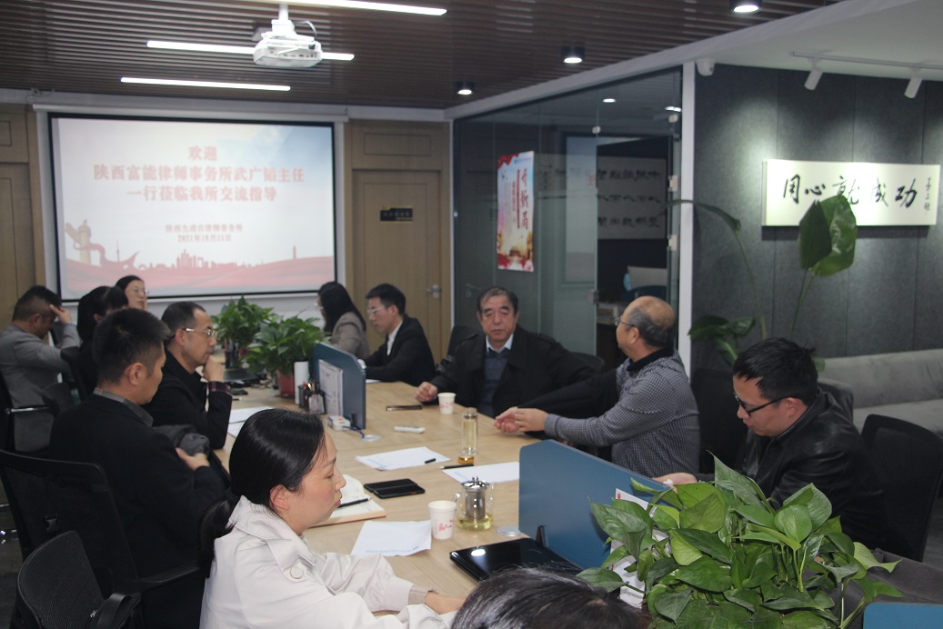 2021年10月15日下午,应陕西九成宫律师事务所闫永宁主任邀请,我所主任武广韬一行参观九成宫律所新址并与在所青年律师交流。该所行政办公室王林护主任主持本次座谈会。名誉主任朱占平出席。